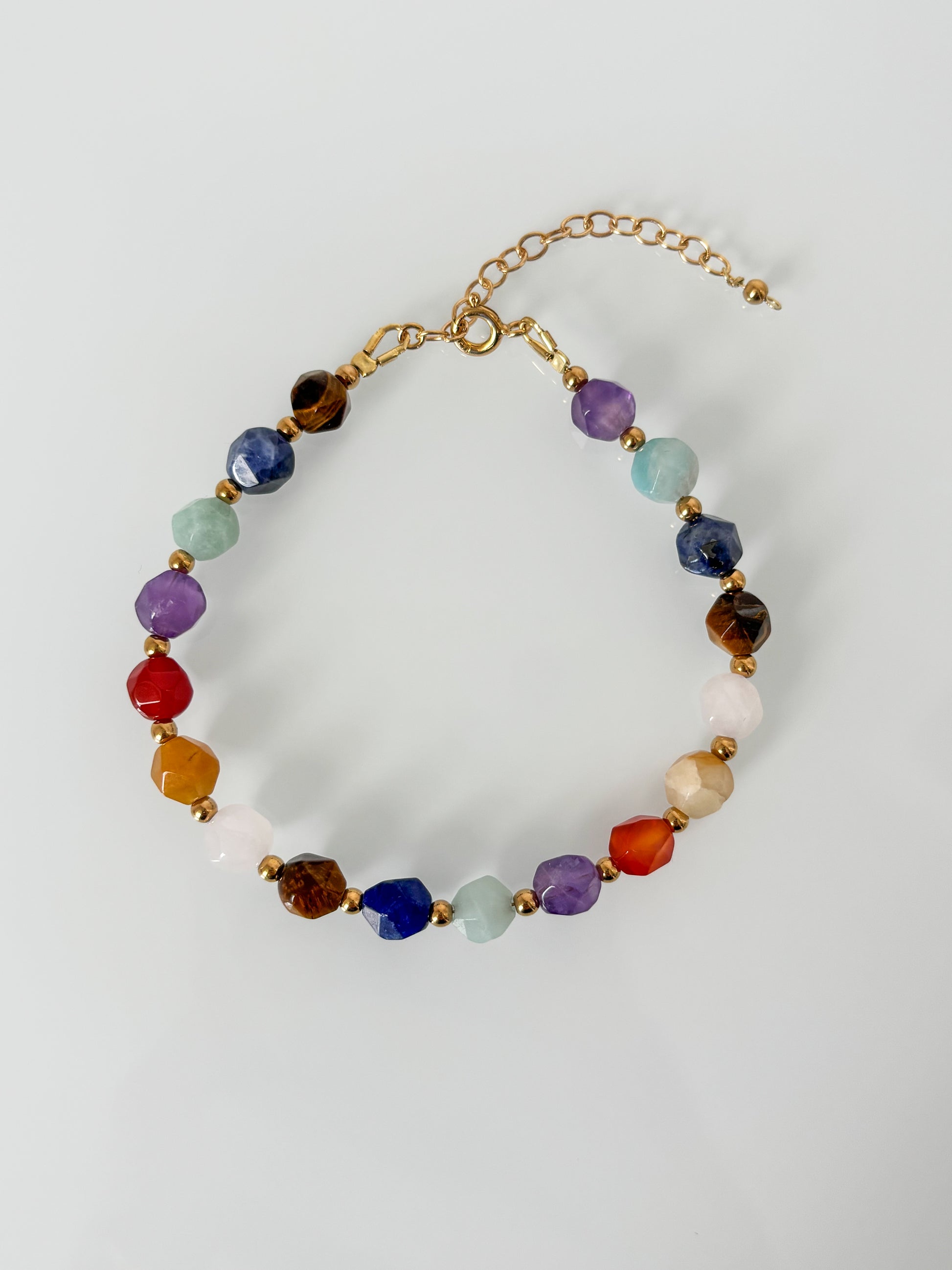 Ręcznie wykonana bransoletka 7 czakr z sodalitem, amazonitem, czerwonym agatem, jadeitem, ametystem, kwarcem różowym, tygrysim okiem, złoconym hematytem 24K oraz elementami pozłacanego srebra próby 925.