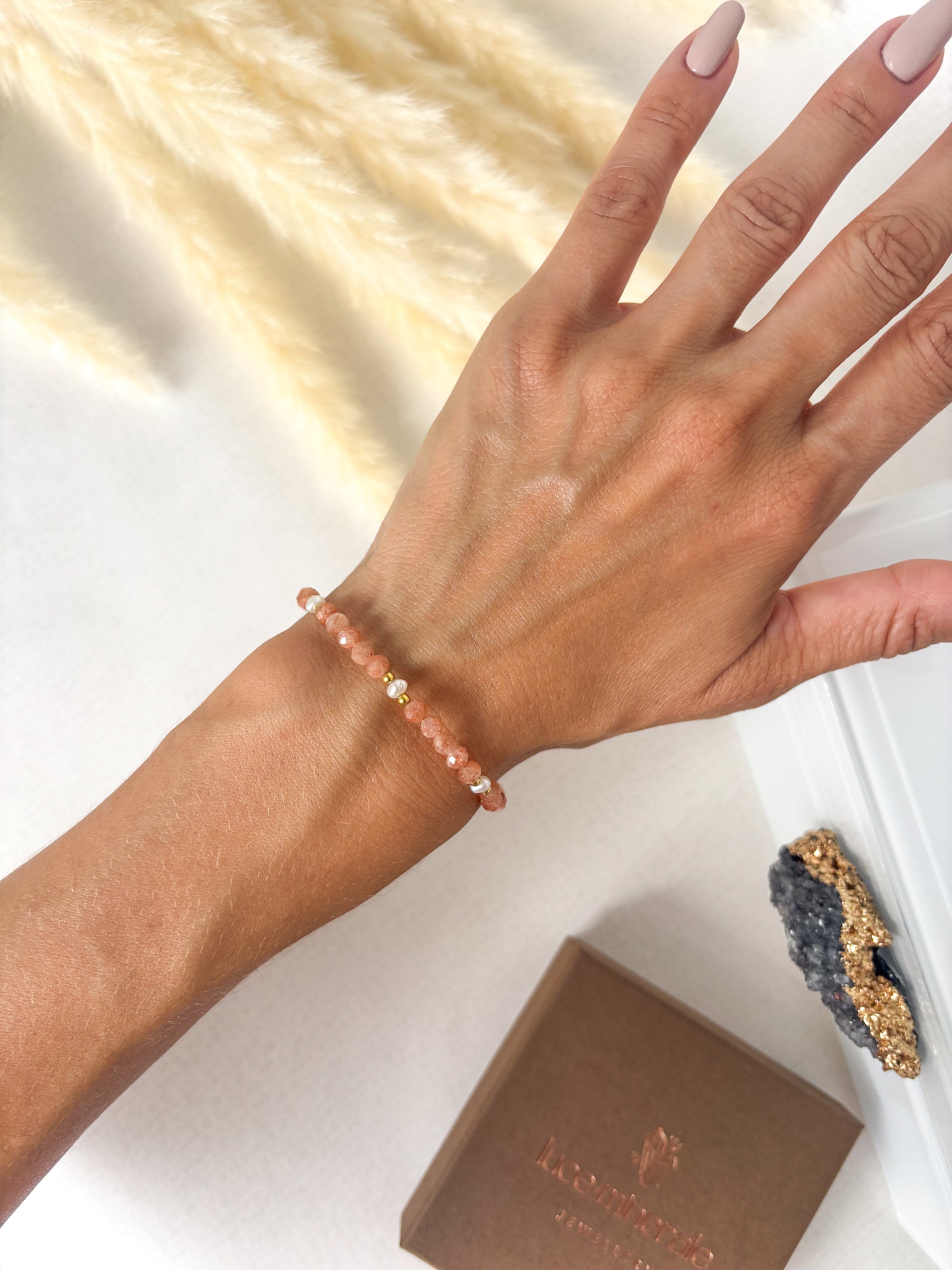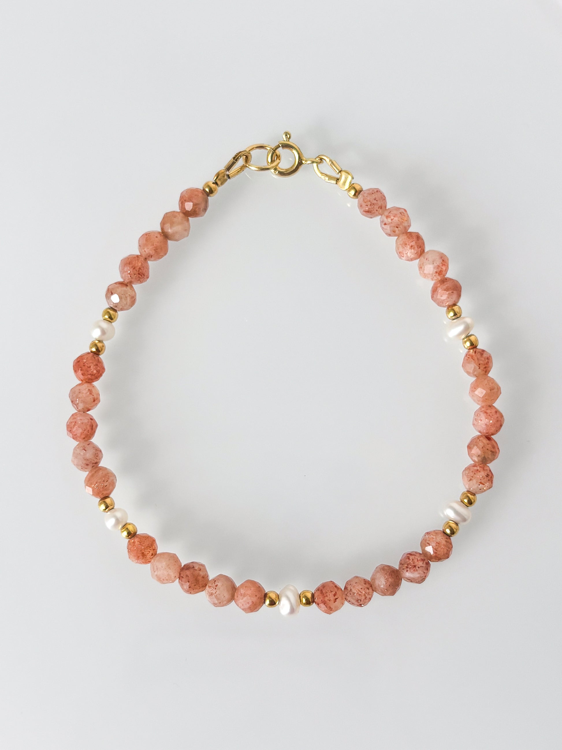 Ręcznie wykonana bransoletka z kamieniem słonecznym, perłą słodkowodną oraz elementami z pozłacanego srebra próby 925.