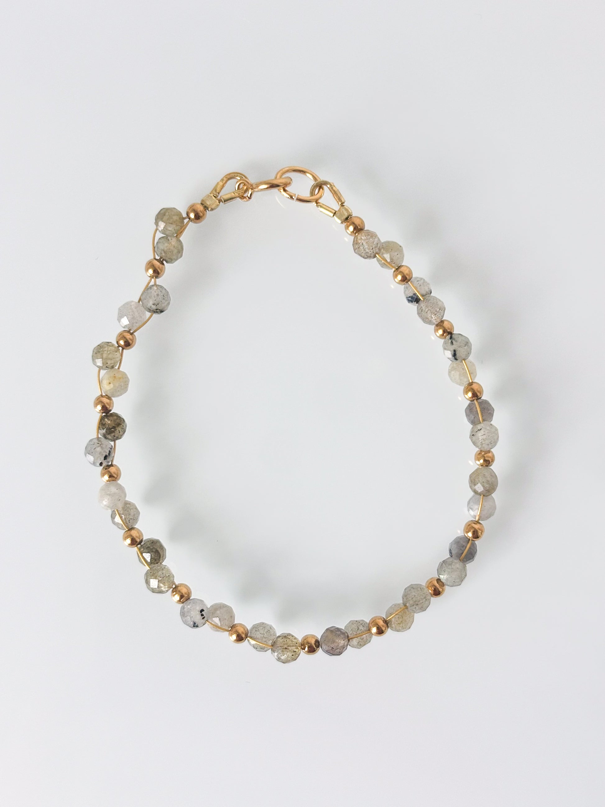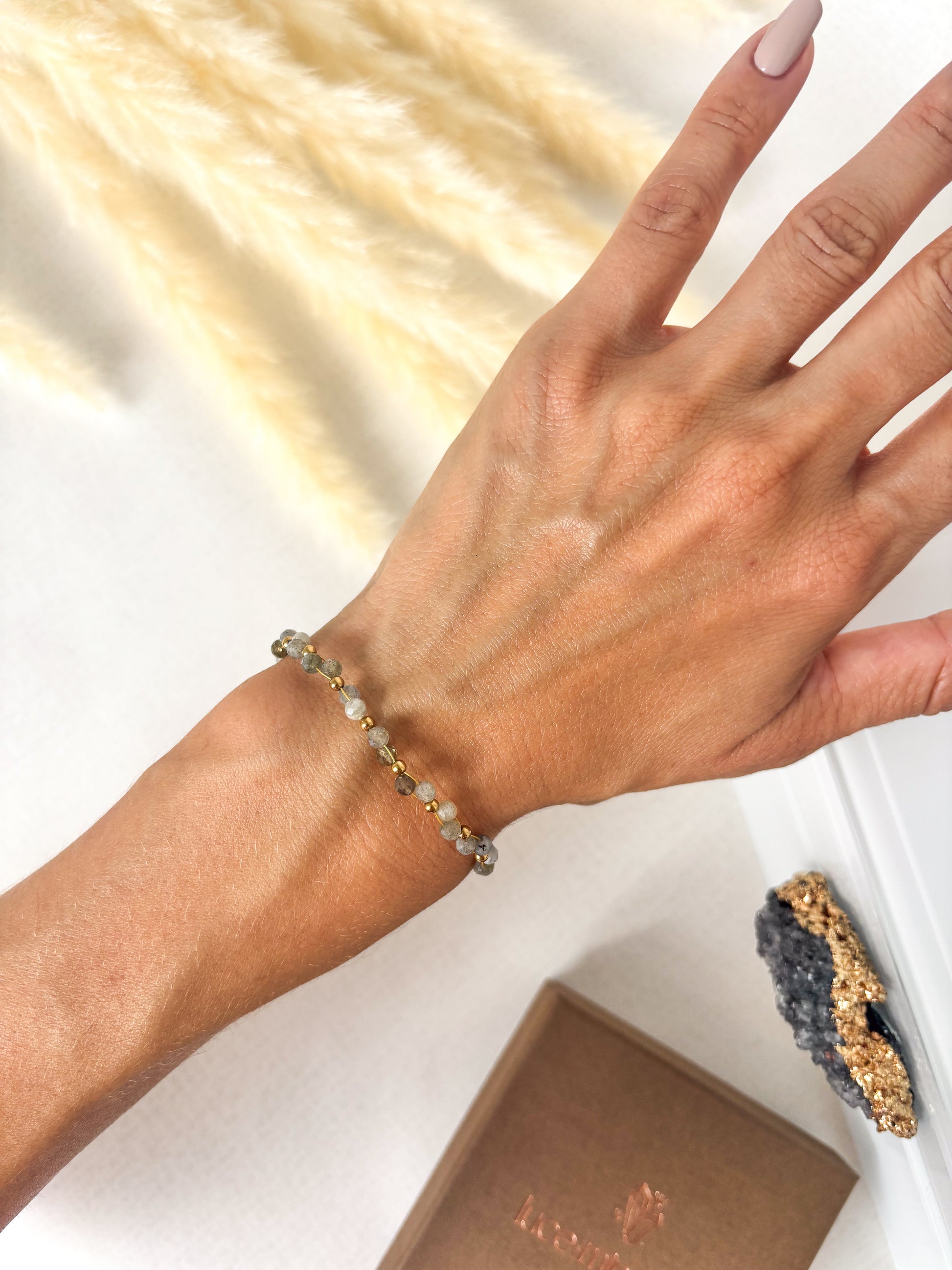 Ręcznie wykonana bransoletka z labradorytem, złoconym hematytem 24K oraz elementami z pozłacanego srebra próby 925.