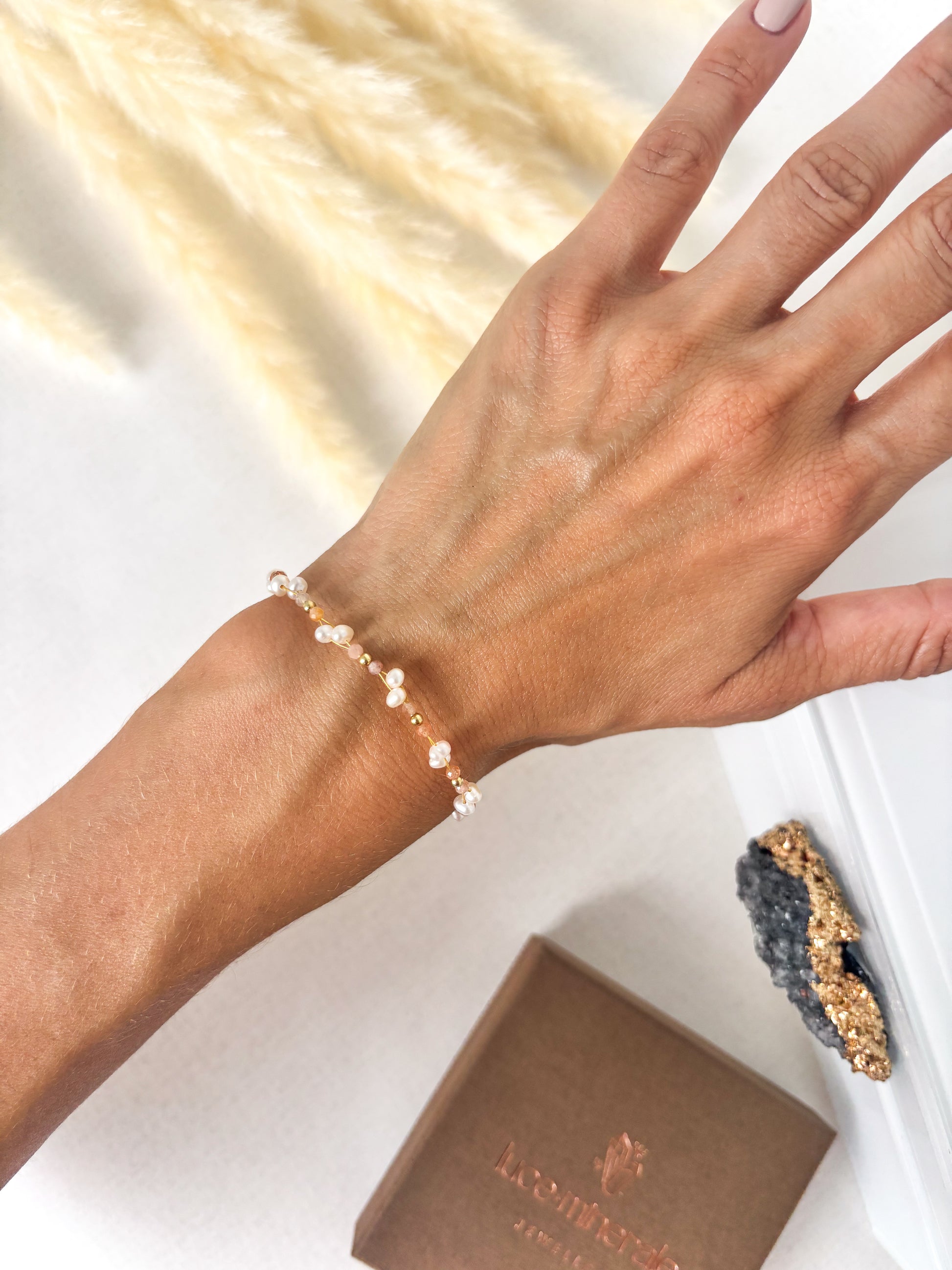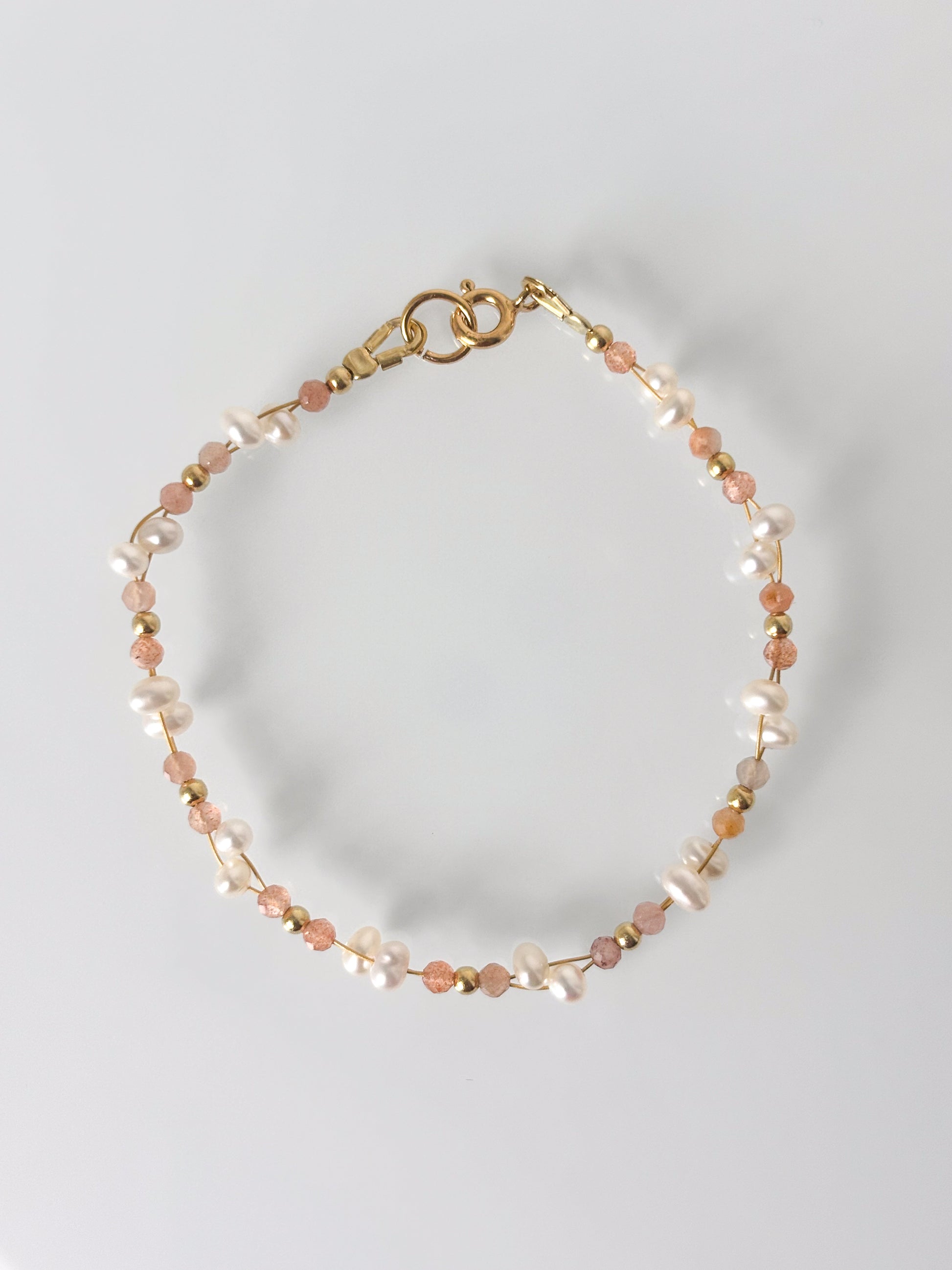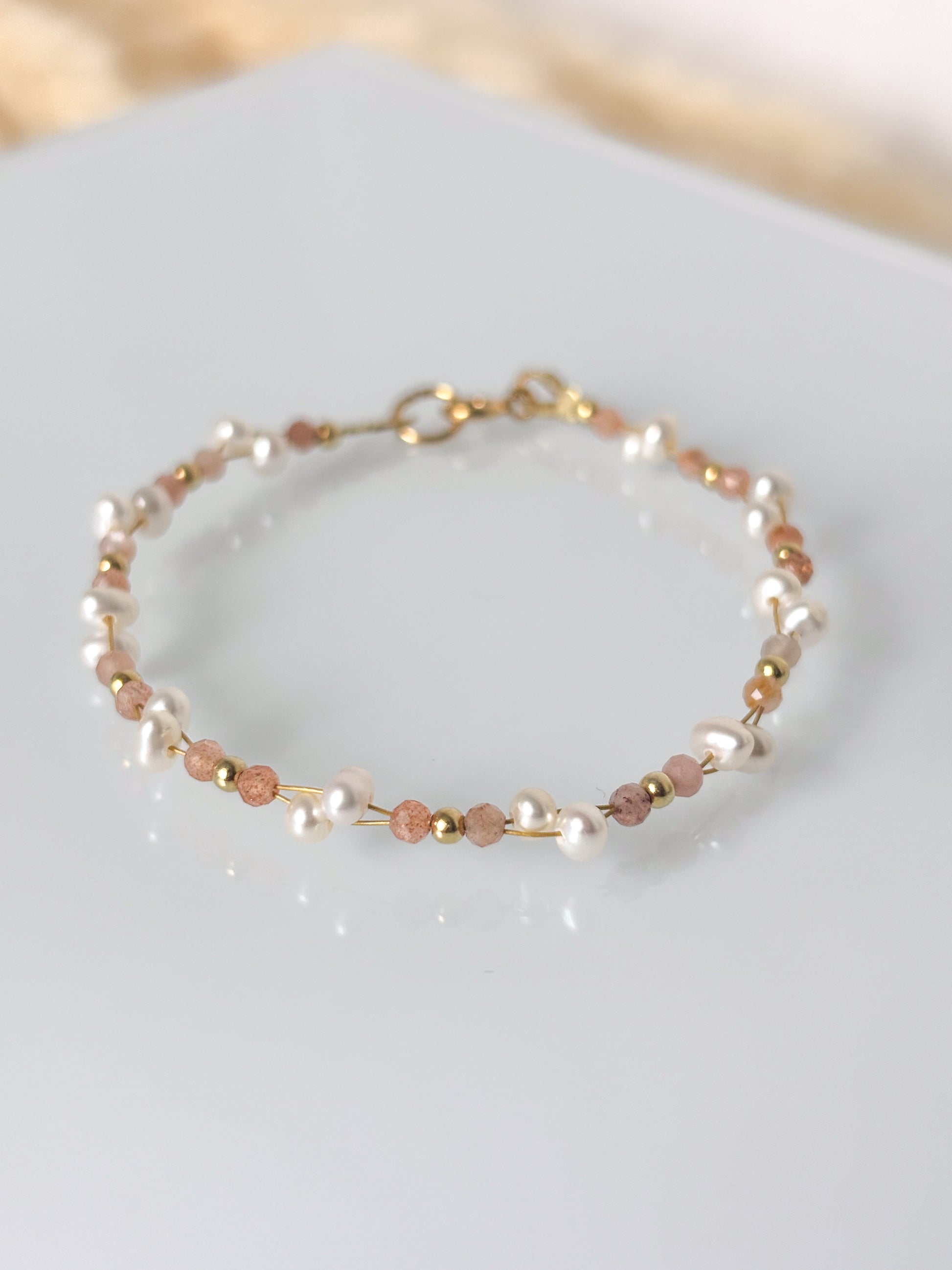 Ręcznie wykonana bransoletka z kamieniem słonecznym, perłą słodkowodną oraz elementami z pozłacanego srebra próby 925.