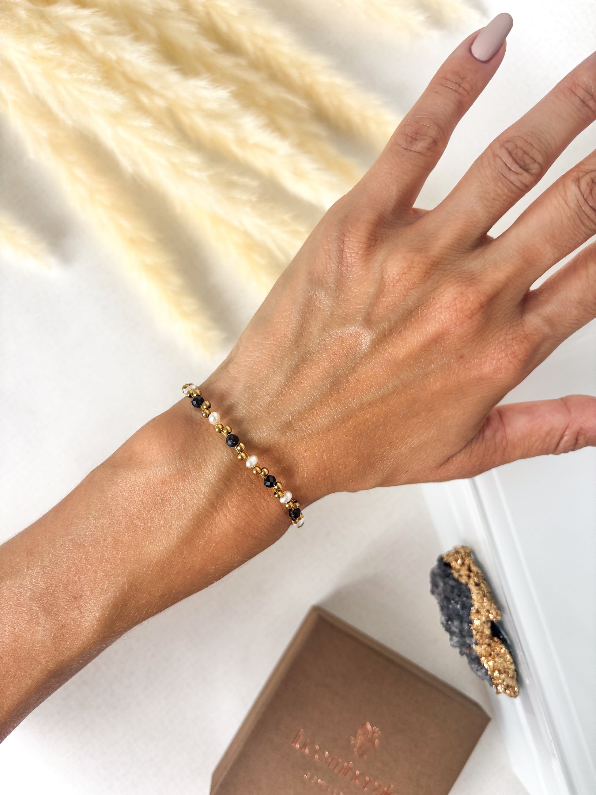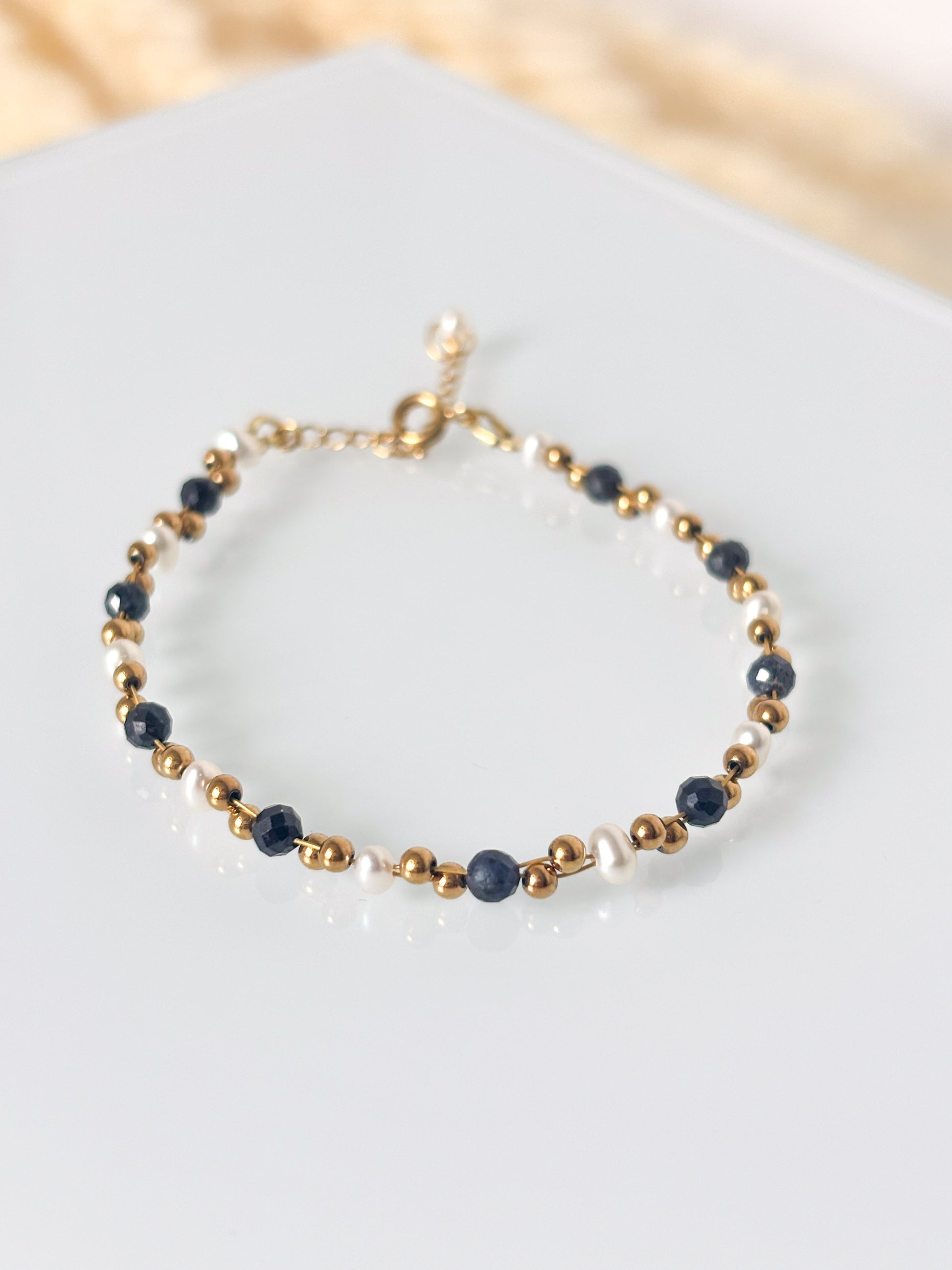 Ręcznie wykonana bransoletka z szafirem, perłą słodkowodną, złoconym hematytem 24K oraz elementami z pozłacanego srebra próby 925.