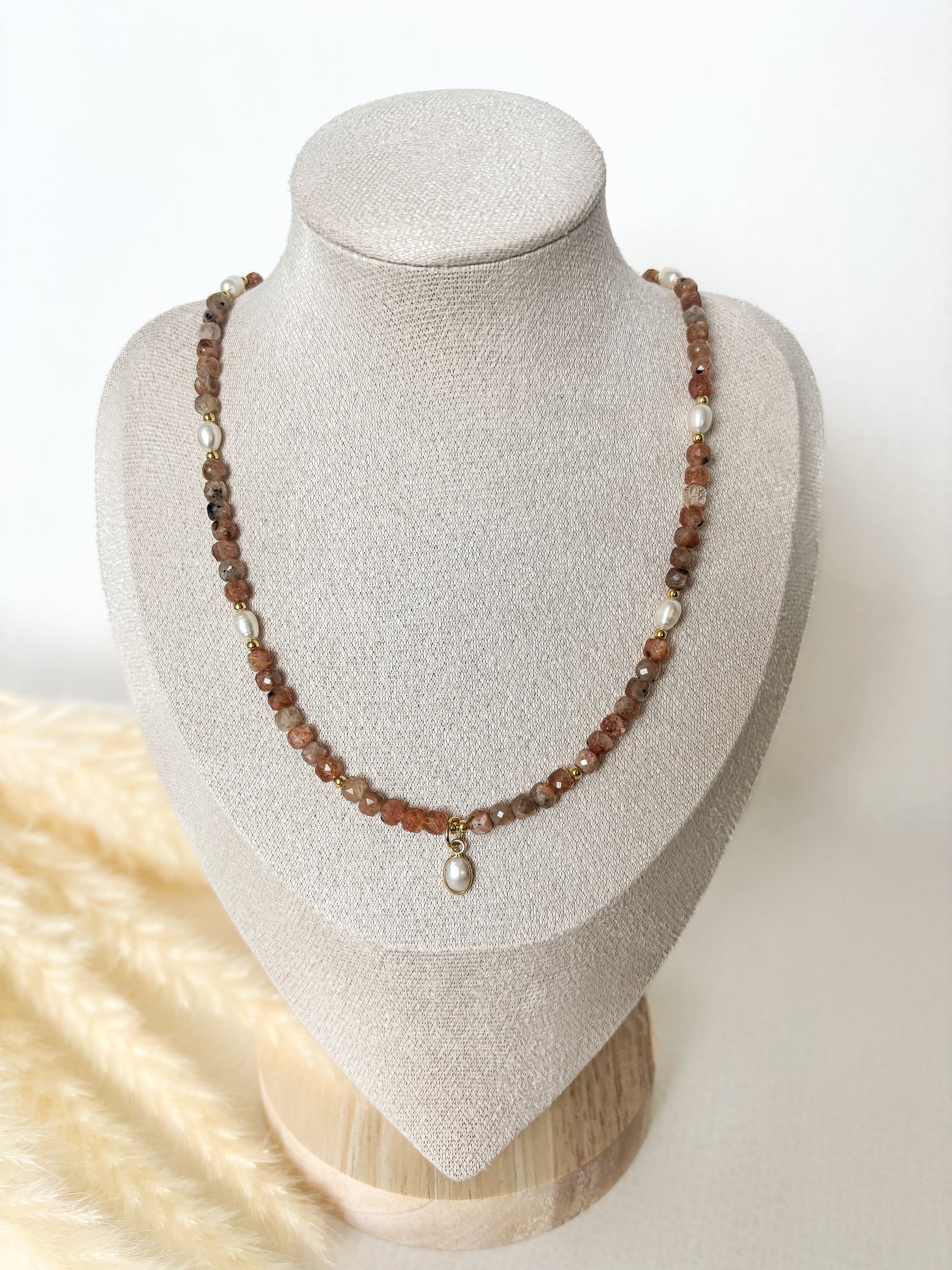 Ręcznie wykonany naszyjnik z kamieniem słonecznym, perłą słodkowodną oraz elementami z pozłacanego srebra próby 925.