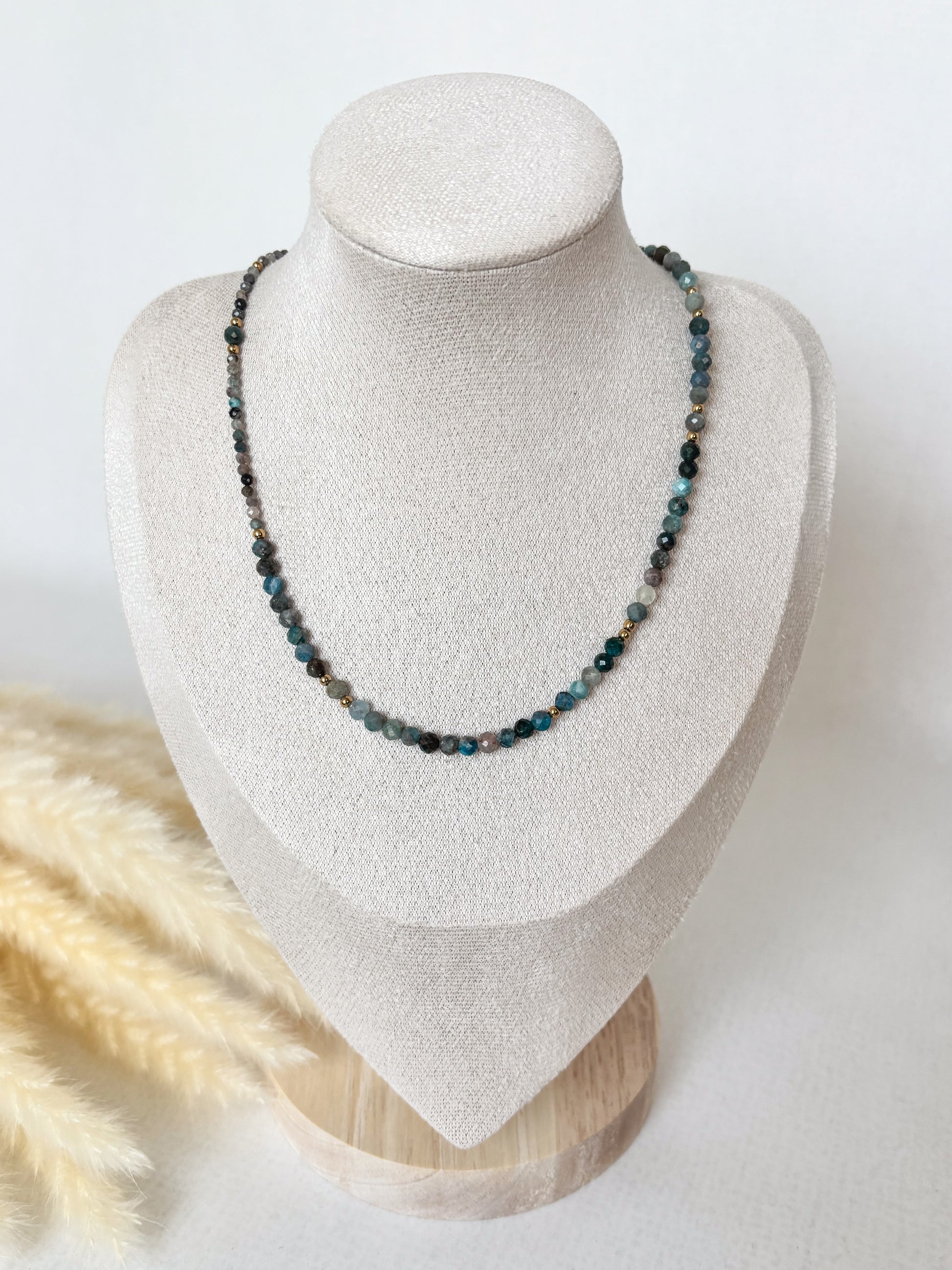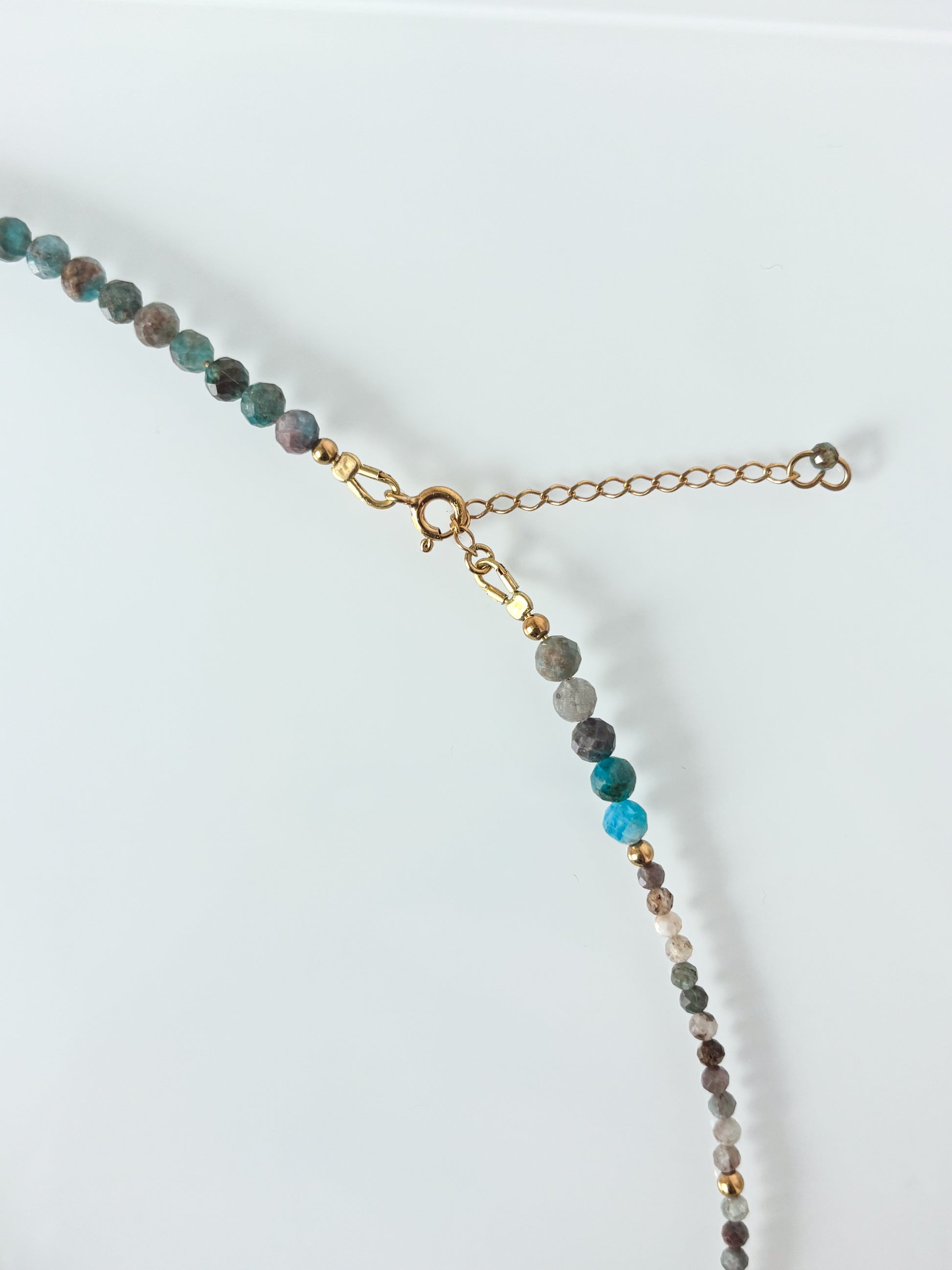 Ręcznie wykonany naszyjnik z apatytem, złoconym hematytem 24K oraz elementami z pozłacanego srebra próby 925.