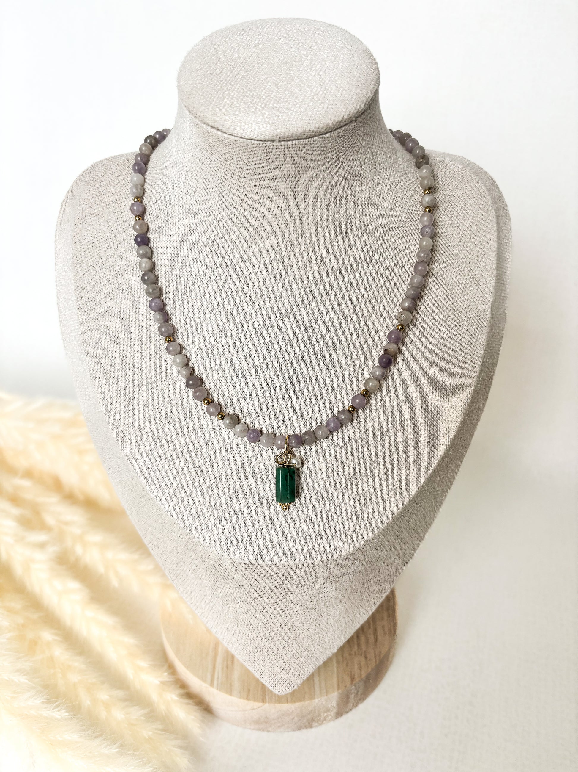 Ręcznie wykonany naszyjnik z jadeitem lawendowym, szmaragdem, perłą słodkowodną, złoconym hematytem 24K oraz elementami pozłacanego srebra próby 925.