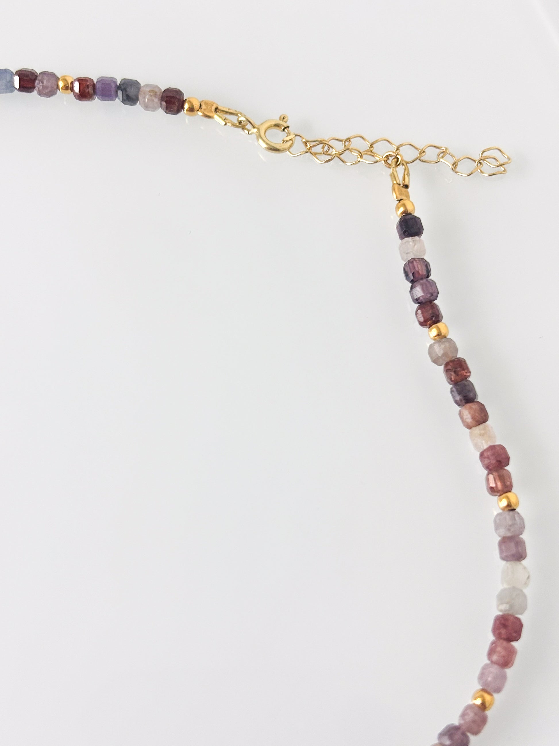 Ręcznie wykonany naszyjnik ze spinelem kolorowym, akwamarynem oraz elementami z pozłacanego srebra próby 925.