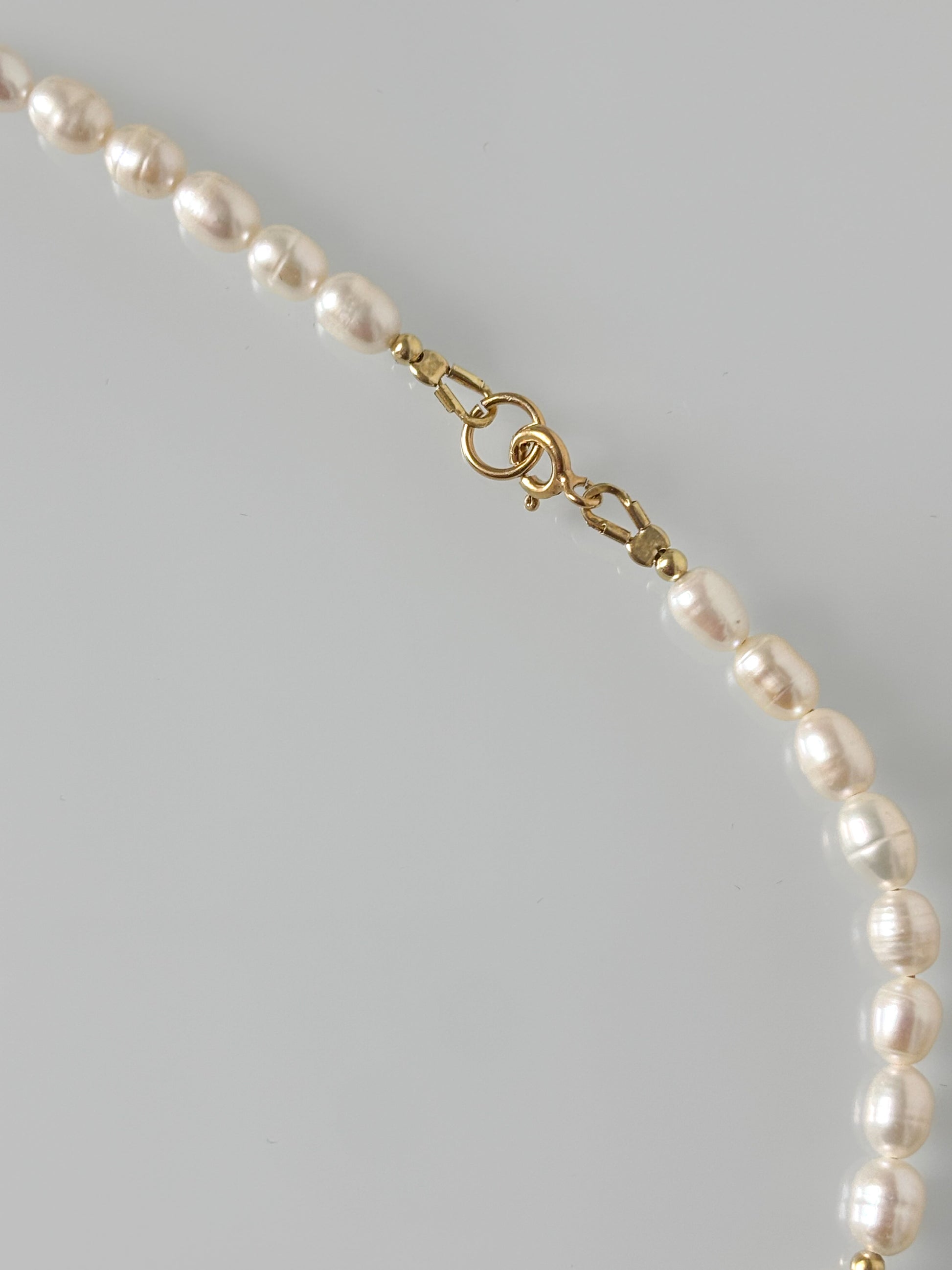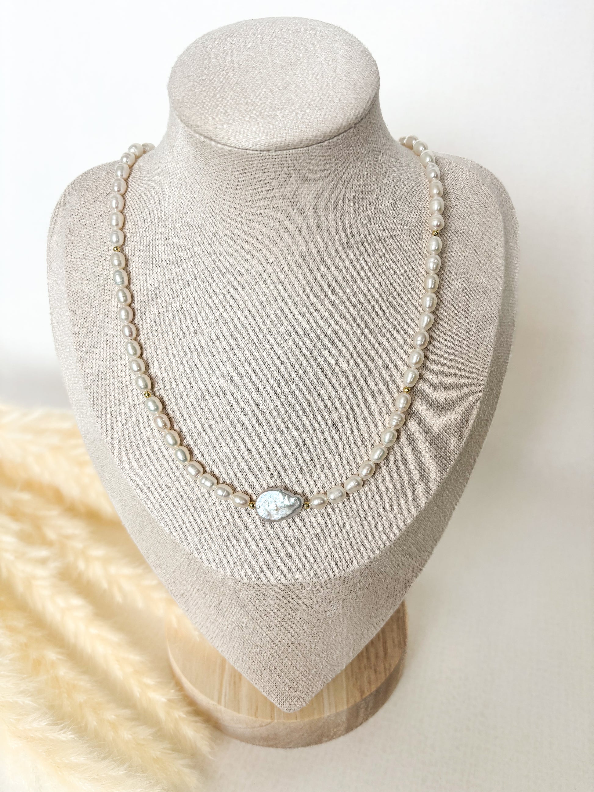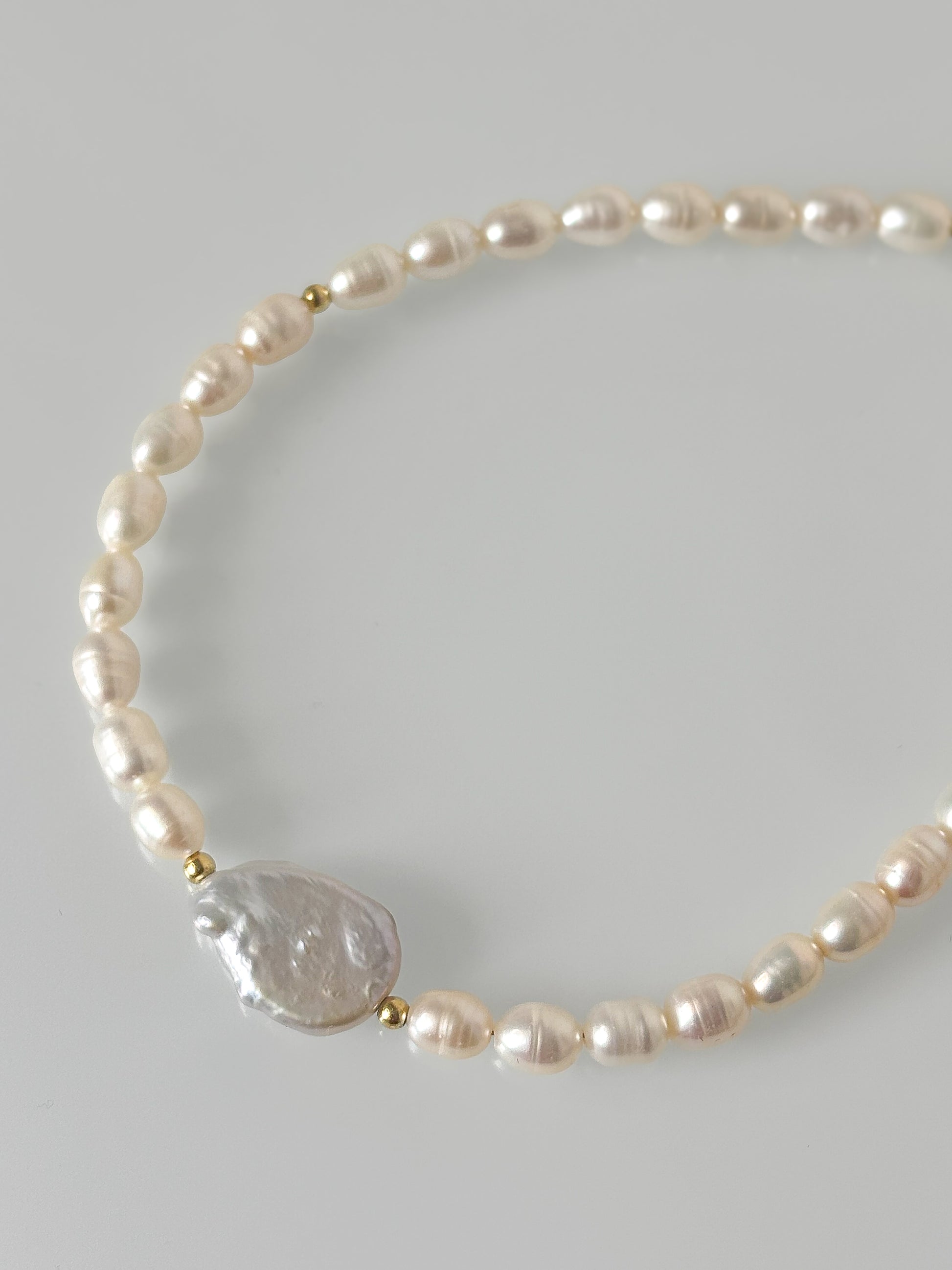 Ręcznie wykonany naszyjnik z perłą słodkowodną, perłą barokową oraz elementami z pozłacanego srebra próby 925.