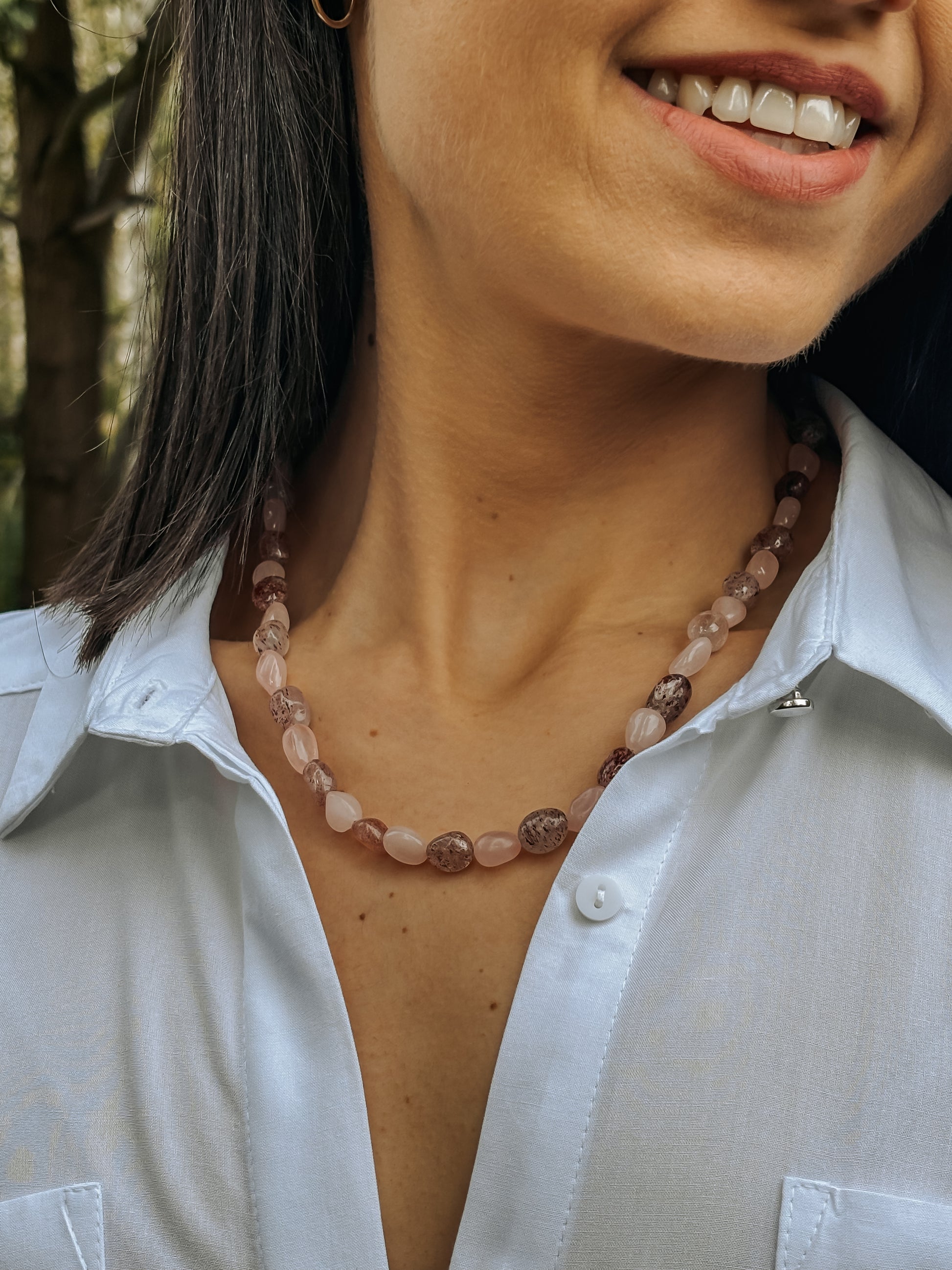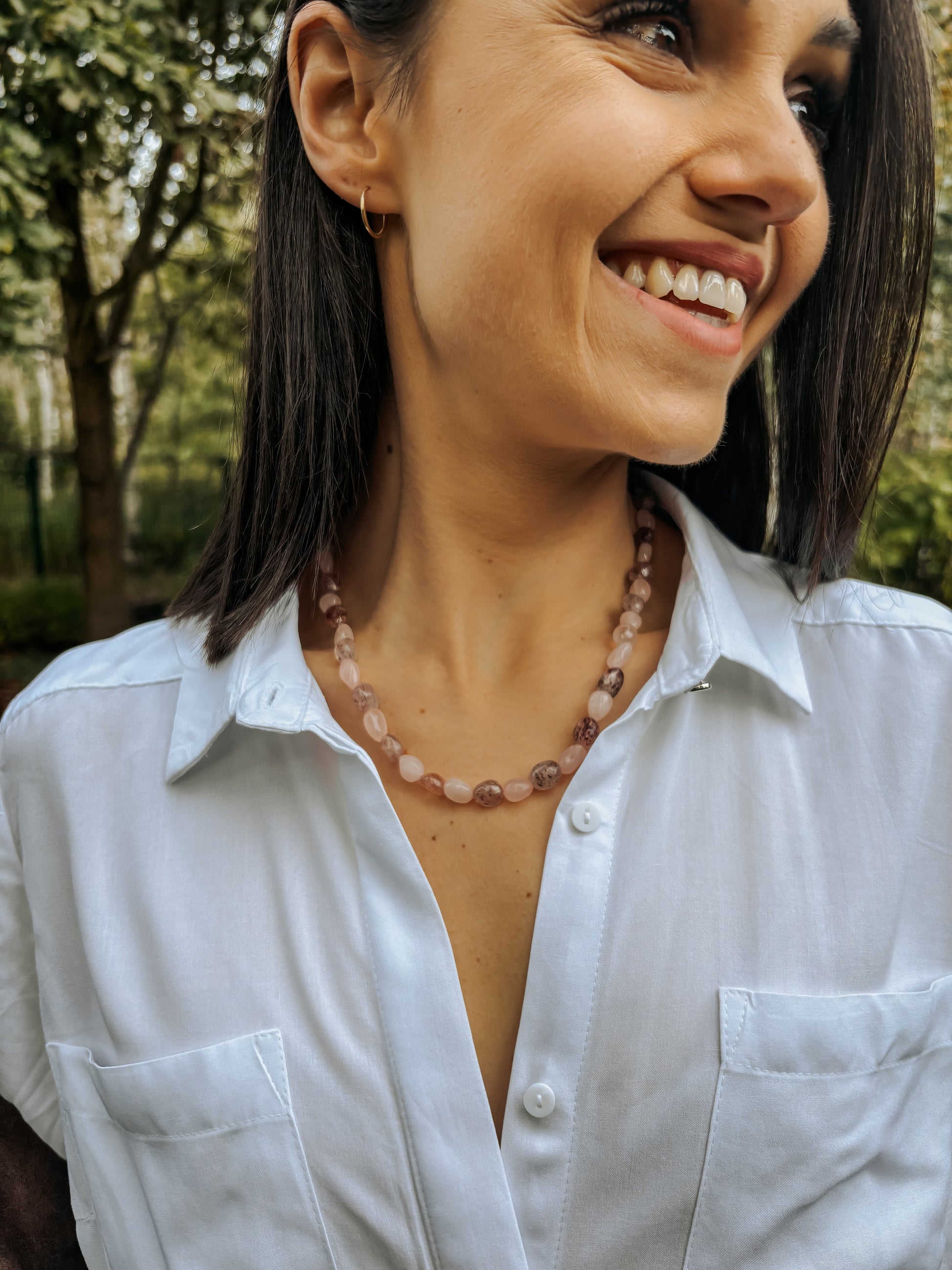 Ręcznie wykonany naszyjnik z kwarcem różowym, kwarcem truskawkowym oraz elementami z pozłacanego srebra próby 925.