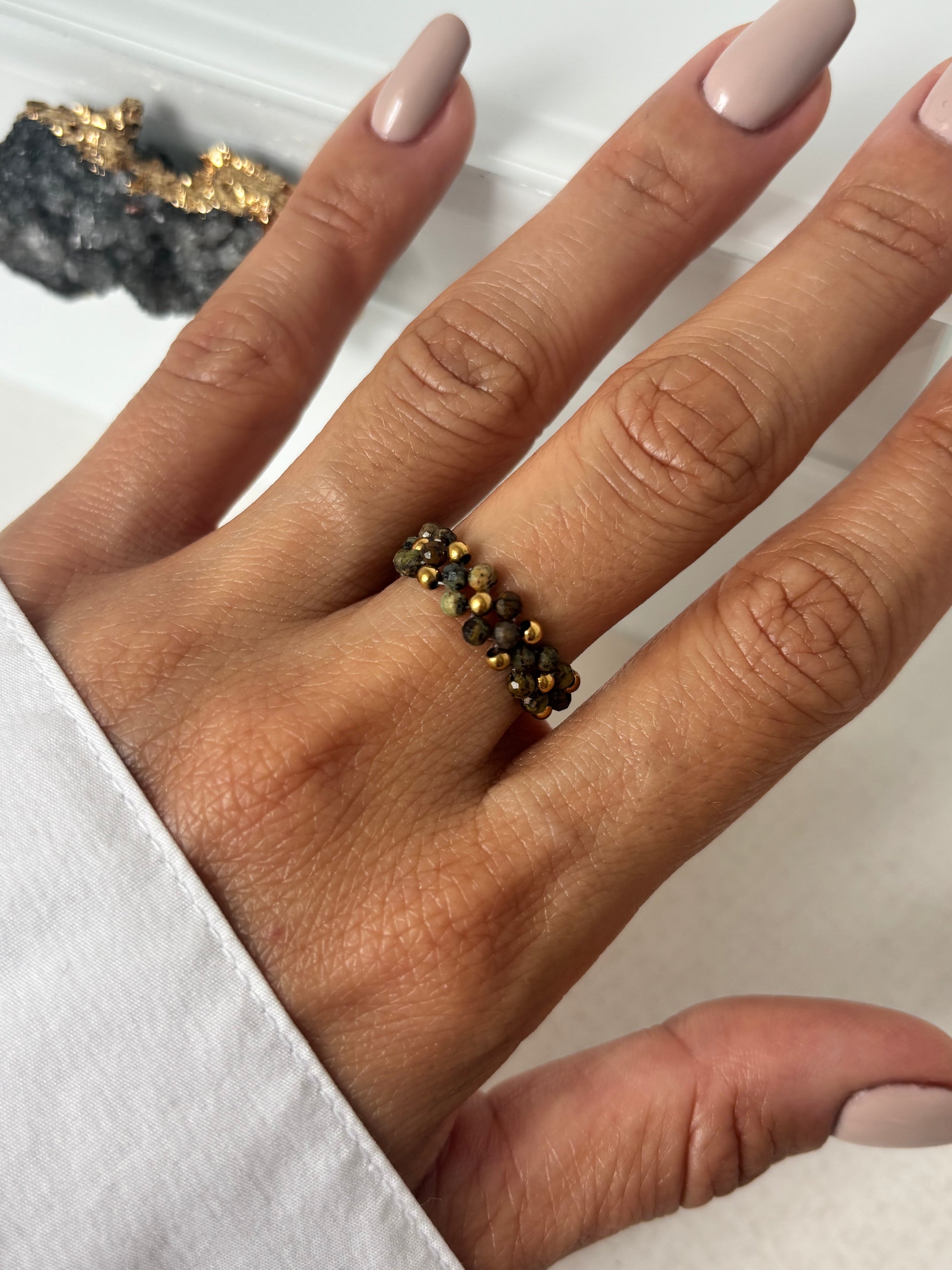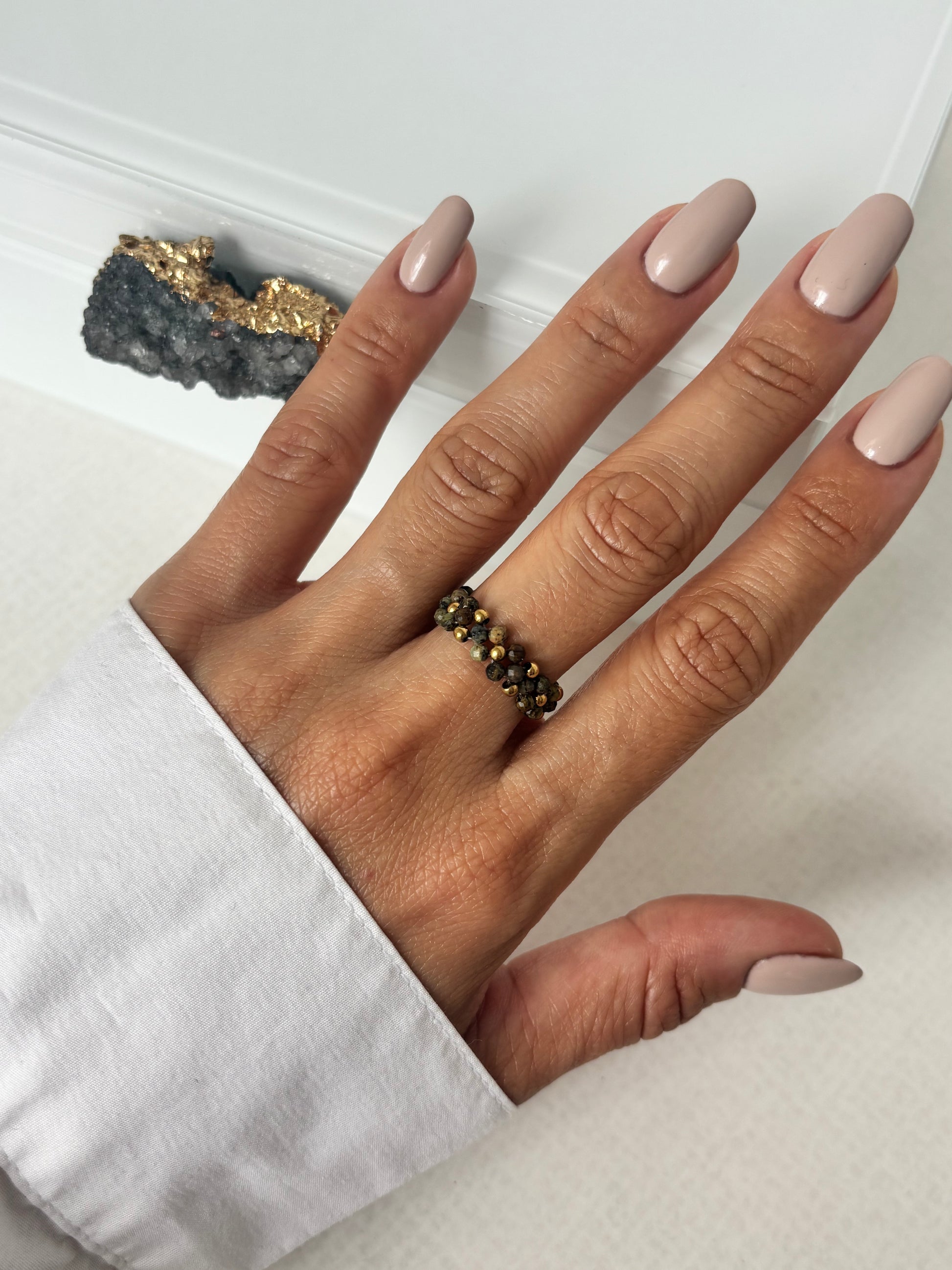 Ręcznie wykonany pierścionek z naturalnych kamieni jadeitu oraz złoconego hematytu 24K.