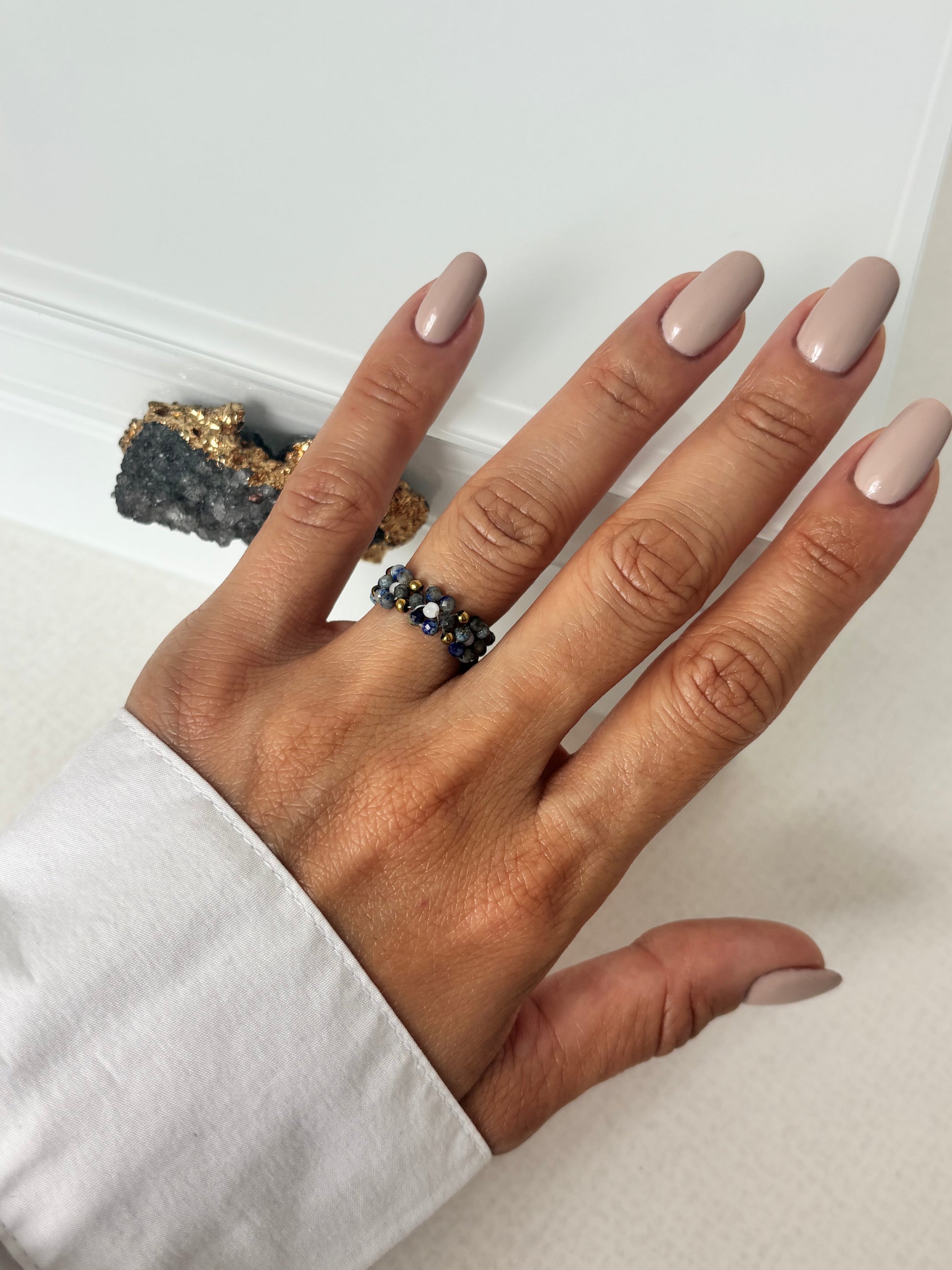Ręcznie wykonany pierścionek z naturalnych kamieni lapisu lazuli, muszli oraz złoconego hematytu 24K.