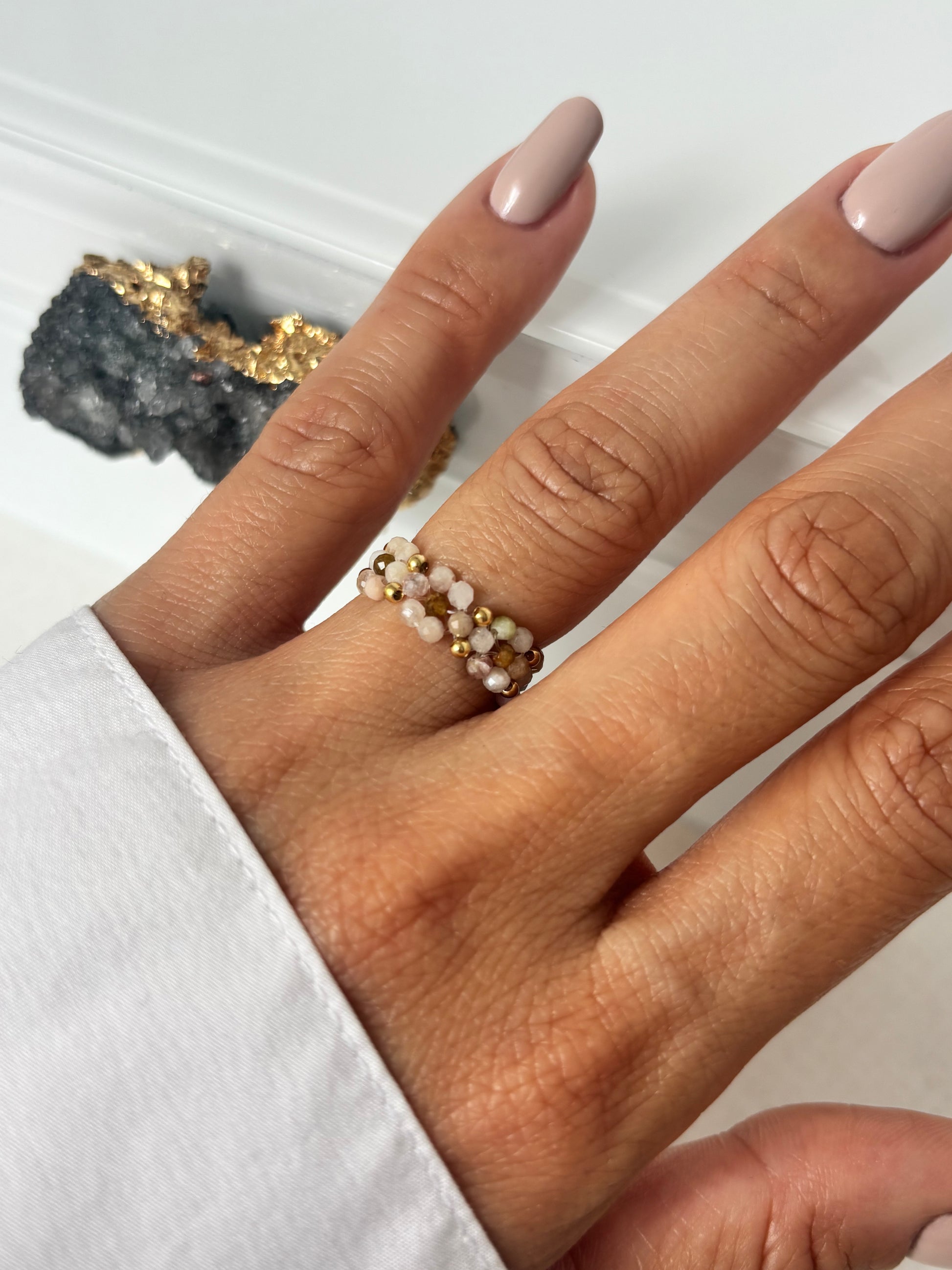 Ręcznie wykonany pierścionek z naturalnych kamieni kolorowego turmalinu oraz pozłacanego srebra próby 925.